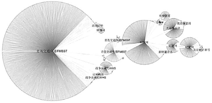 该网友在现实中是一名普通游客,在网络中运用的是微博小号,都属于没有社会资源的弱者。但是互联网的开放性和关联性,使其能够跳出个人社会网络,与媒体、网络意见领袖等情感能量较高的主体建立直接或间接关系,通过他们的影响力来传播和修复个体愤怒。据统计,@青岛交通广播FM897关于青岛大虾事件的最初报道在一周内被3261个主体转发,其中媒体22个,大V220个,普通用户3012个,其他机构7个。这些主体因对当事人遭遇的情绪事件的共同关注和情感连带而通过暂时的弱关系连接形成虚拟在场的群体,群体成员站在自己的立场对该事件进行评价和解释。对当事人的同情、对店家的愤怒和对相关部门的失望、嘲讽,种种情绪相互交织,形成一场盛大的情绪互动仪式。当事人的个体情绪在互动中融入了参与者的相关情绪经验,得到普遍的情绪理解,最终被整合成为集体体验,以群体压力的形式迫使相关部门解决问题、平复集体情绪。那些粉丝数量较多的主体(媒体、大V)拥有较高的情感能量(社会资本),具有更大的影响力,在图中呈现出更大的圆圈,其社会网络对于情绪的传播和整合起了重要作用。