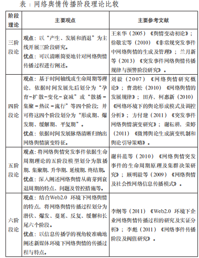 从表中可以看出,四阶段论模型、五阶段论模型和六阶段论模型实质上都是对三阶段论模型的细分、补充和完善。无论是哪个阶段论的模型,都从不同的理论角度对网络舆情的传播阶段进行了区分,并且呈现出各自的特点。