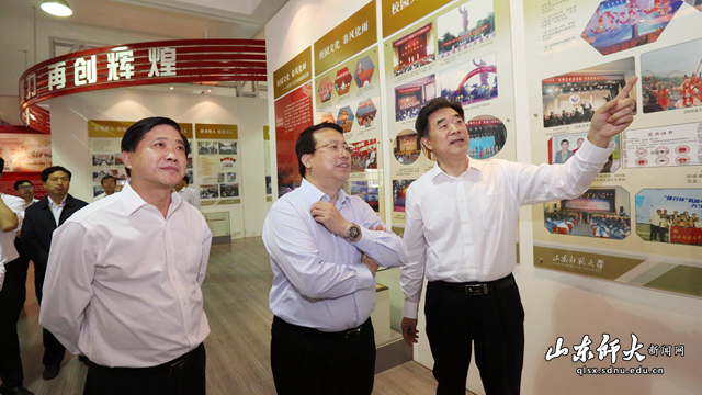 龚正一行先后来到大学生活动中心、图书馆等处考察调研。调研过程中,龚正参观了学校办学成就展,详细听取了学校党政主要负责同志对学校办学历史、人才培养、科研创新、社会服务、办学特色、校区规划等情况的汇报,对学校过硬的人才培养质量、丰硕的育人成果表示赞赏,希望山东师大进一步深化教育综合改革,强化一流学科建设,主动对接地方社会经济文化发展,充分发挥特色优势,为办好人民满意的高等教育作出新的更大贡献。