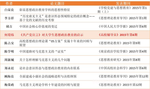 2015年12月,秘书处印发通知后,马克思主义理论期刊联盟单位包括《北京教育(德育版)》、《辅导员学刊》、《高校辅导员》、《思想教育研究》、《思想理论教育》、《思想理论教育导刊》、《思想政治教育研究》、《学校党建与思想教育》以及中国人民大学书报中心积极按照申报要求进行内部遴选并组织专家撰写推荐意见。2016年3月下旬至4月初,秘书处把通过资格审查的50多篇论文分送高校思想政治理论课教指委、马克思主义理论学科领域的专家以及联盟内各期刊负责人等共20多位专家进行评审。4月下旬召开推选会议,依据前期专家评审情况,并综合考虑论文的学术影响,通过专家集体投票,推选出以上10篇“2015年度高校马克思主义理论影响力论文”。