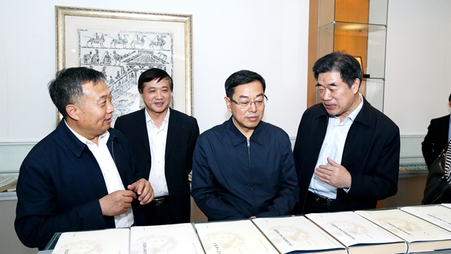 杨东奇首先来到学校教育部人文社科重点研究基地齐鲁文化研究院。燕生东教授介绍了基地性质、功能、建设情况以及近几年取得的成果,杨东奇现场翻阅了基地重点学术工程《齐鲁文化通史》《山东区域文化通览》和《山东文化世家研究丛书》等研究成果,对其内容、学术意义、社会影响以及对山东文化建设发挥的作用表示赞赏,对齐鲁文化研究院取得的成绩给予充分肯定。希望山东师大充分认识齐鲁文化在中国优秀传统文化的作用和地位,继续加强齐鲁文化资源的挖掘、整理与研究工作,尤其是深入研究齐文化内容、历史发展脉络以及对当代社会的影响与价值,重点做好齐文化的传承和弘扬工作。他还建议全省领导干部国学学习班可以到齐鲁文化研究院参观学习,加深对齐鲁文化的了解。