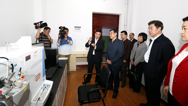 随后,杨东奇来到化学化工与材料科学学院重点实验室参观指导。他饶有兴趣地考察了学院实验室大型仪器设备,详细询问了仪器的性能用途及运行情况,并与实验室科研人员进行热烈交流。参观过程中,唐波作为“973”首席科学家,向杨东奇生动形象地介绍了学院目前所从事的在健康卫生、环境能源等领域开展的研究工作,着重介绍了近几年在运用分子与纳米光学探针实现肿瘤细胞荧光成像研究方面取得的重要研究成果。杨东奇对学院取得的成绩表示祝贺,并勉励实验室广大科研人员奋发图强,利用先进的科研平台做出更多国际一流的科研成果,培养更多的高层次人才,促进山东高等教育快速健康发展。