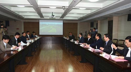 走进科技创新大楼,张宪省介绍作物生物学国家重点实验室的情况,实验室从群体、个体与分子水平上研究作物高产、优质、高效、生态、安全等科学和技术问题,形成了作物生理生态、作物分子生物学、作物种质创新三个研究方向。近年来承担了250余项课题,包括国家重大研究计划项目首席、国家“973”课题、国家“863”等,总经费达到2个多亿,培育出作物新品种28个。杨东奇称赞重点实验室所取得的成绩,并与大家探讨了转基因食品的安全问题。