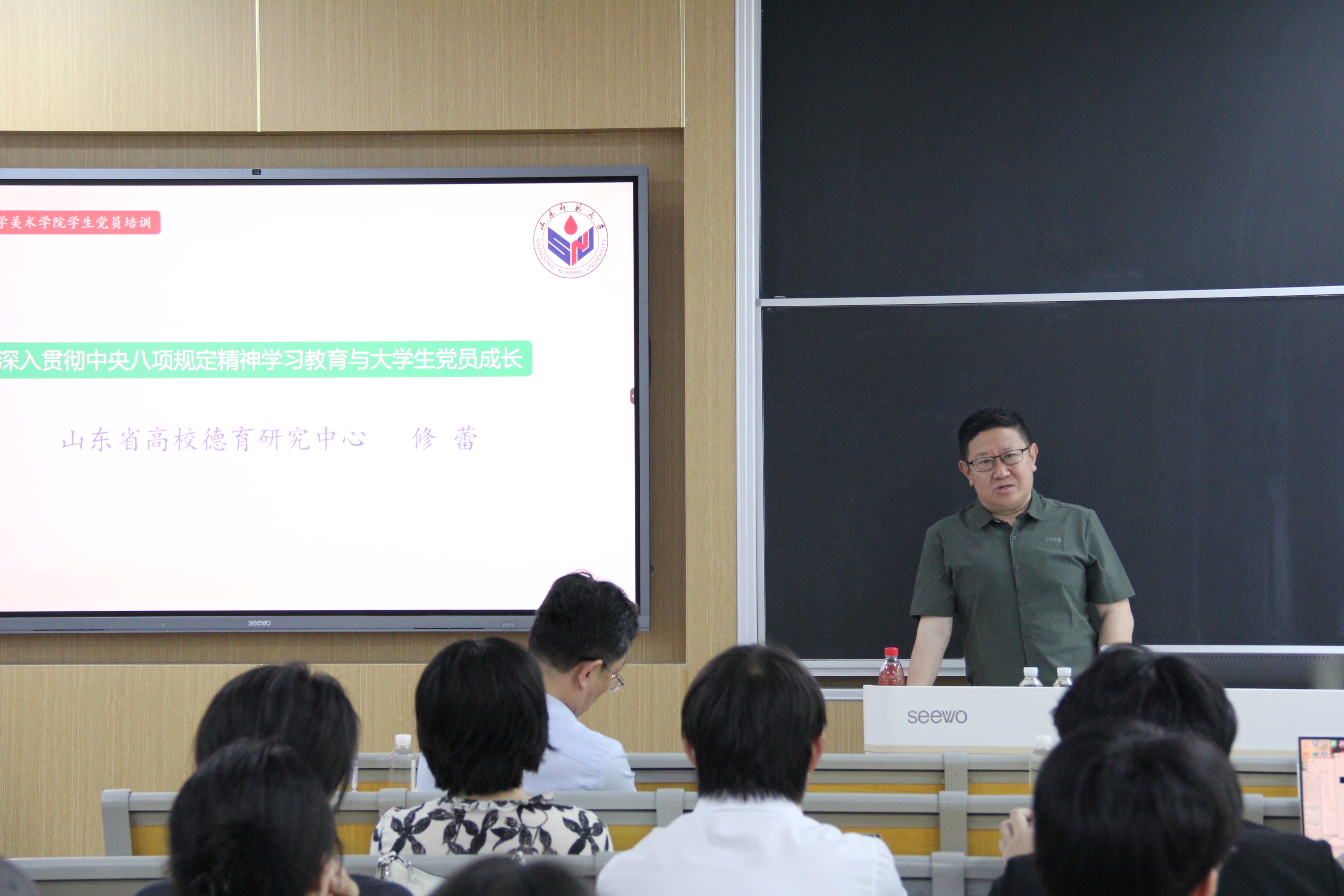 6月18日下午,山东省高校德育研究中心主任修蕾研究员为山东师范大学美术学院学生党员讲授“深入贯彻中央八项规定精神学习教育与大学生党员成长”专题党课。美术学院党委书记崔勇主持活动,学院团委书记李明,辅导员王书艳、宋俐志及全体学生党员到场聆听。