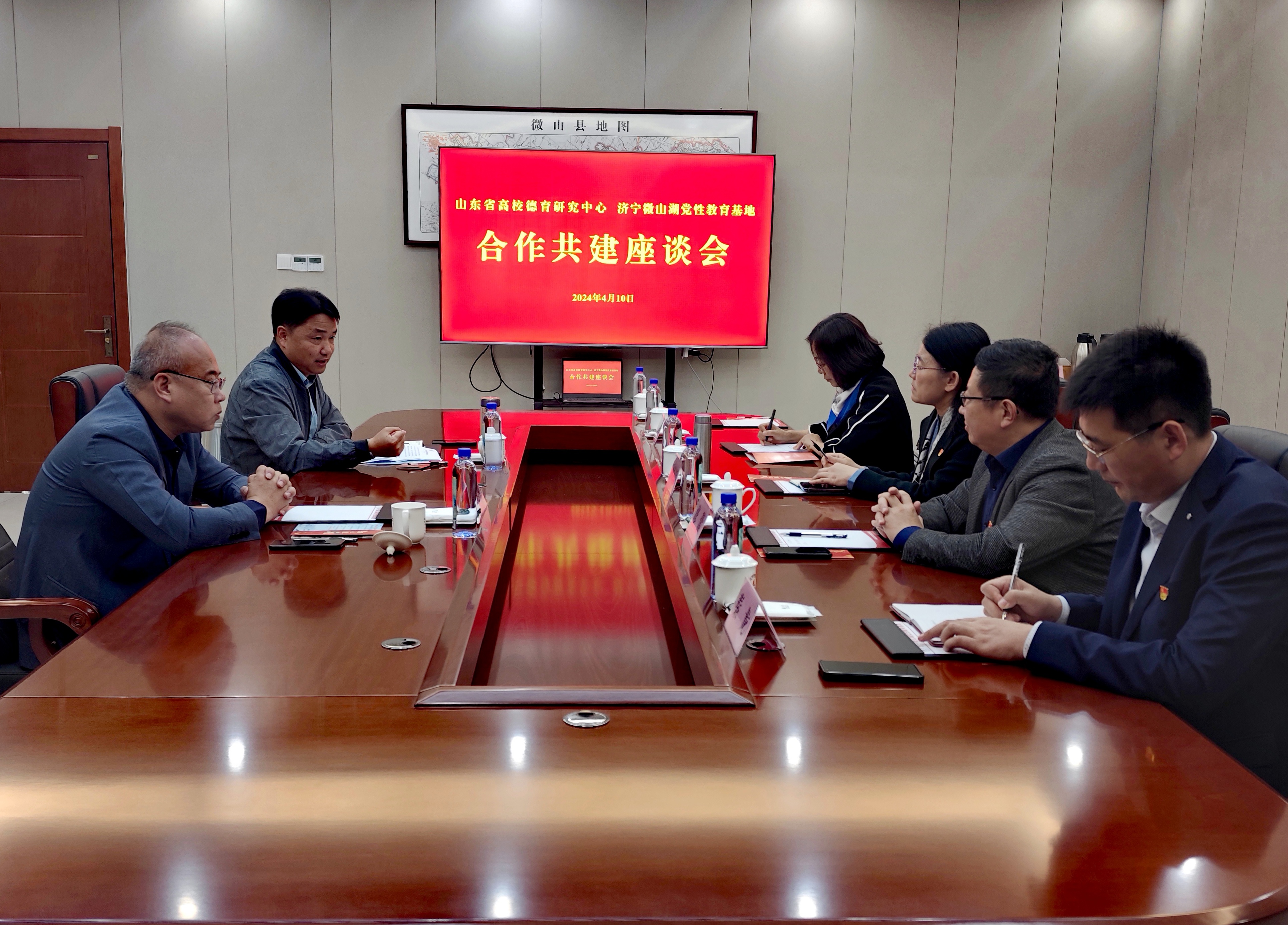 4月10日,山东省高校德育研究中心与济宁微山湖党性教育基地合作共建座谈会在济宁微山召开。山东省高校德育研究中心主任修蕾、山东师范大学直属单位党委书记孙芙蓉、山东省高校德育研究中心副主任徐稳,微山县政协副主席王志刚、微山湖党性教育基地主任刘维出席活动。