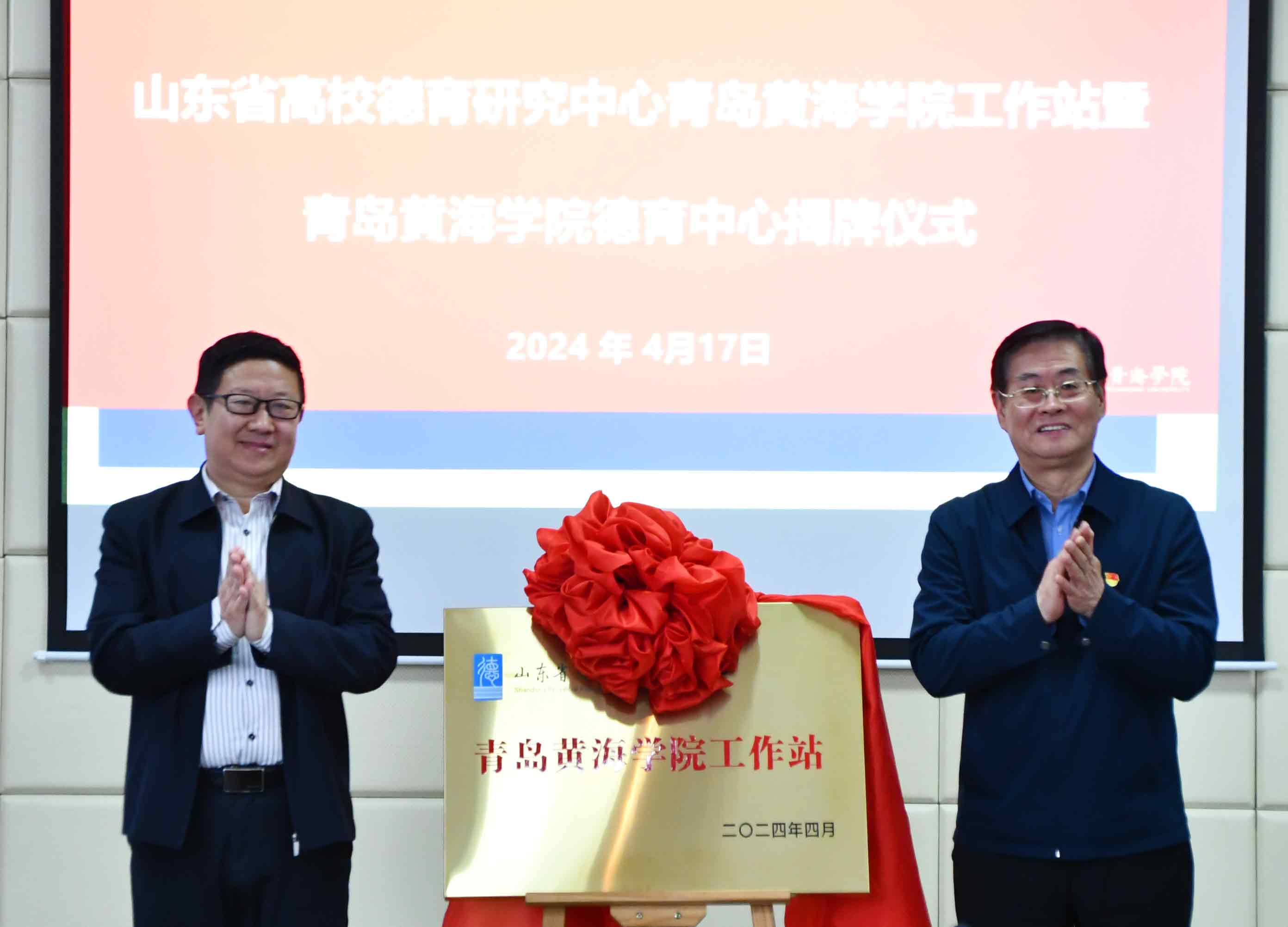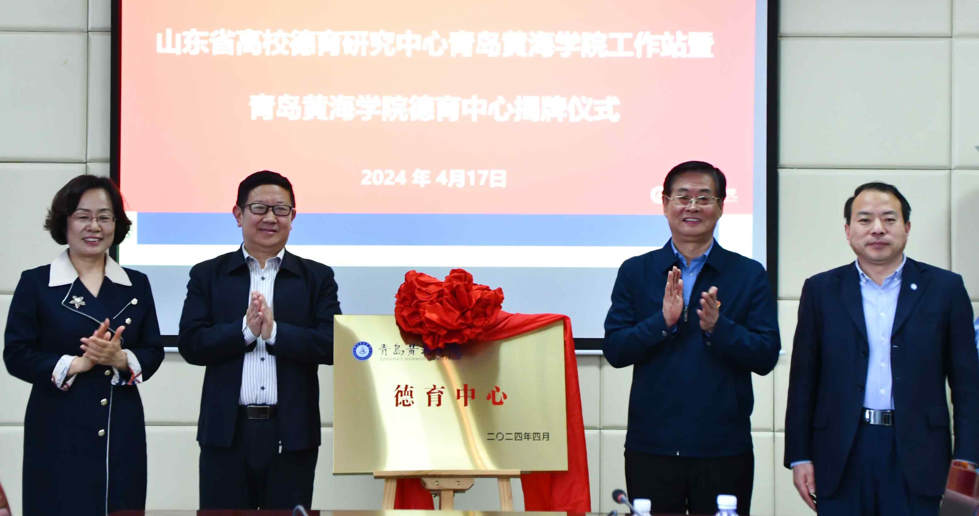 修蕾、邢桂强共同为山东省高校德育研究中心青岛黄海学院工作站揭牌。修蕾、邢桂强、徐稳、梁忠环共同为青岛黄海学院德育中心揭牌。